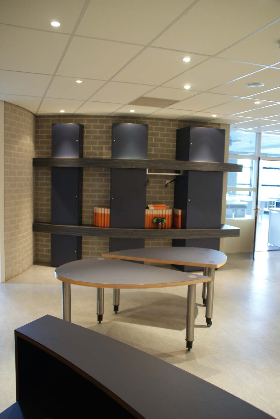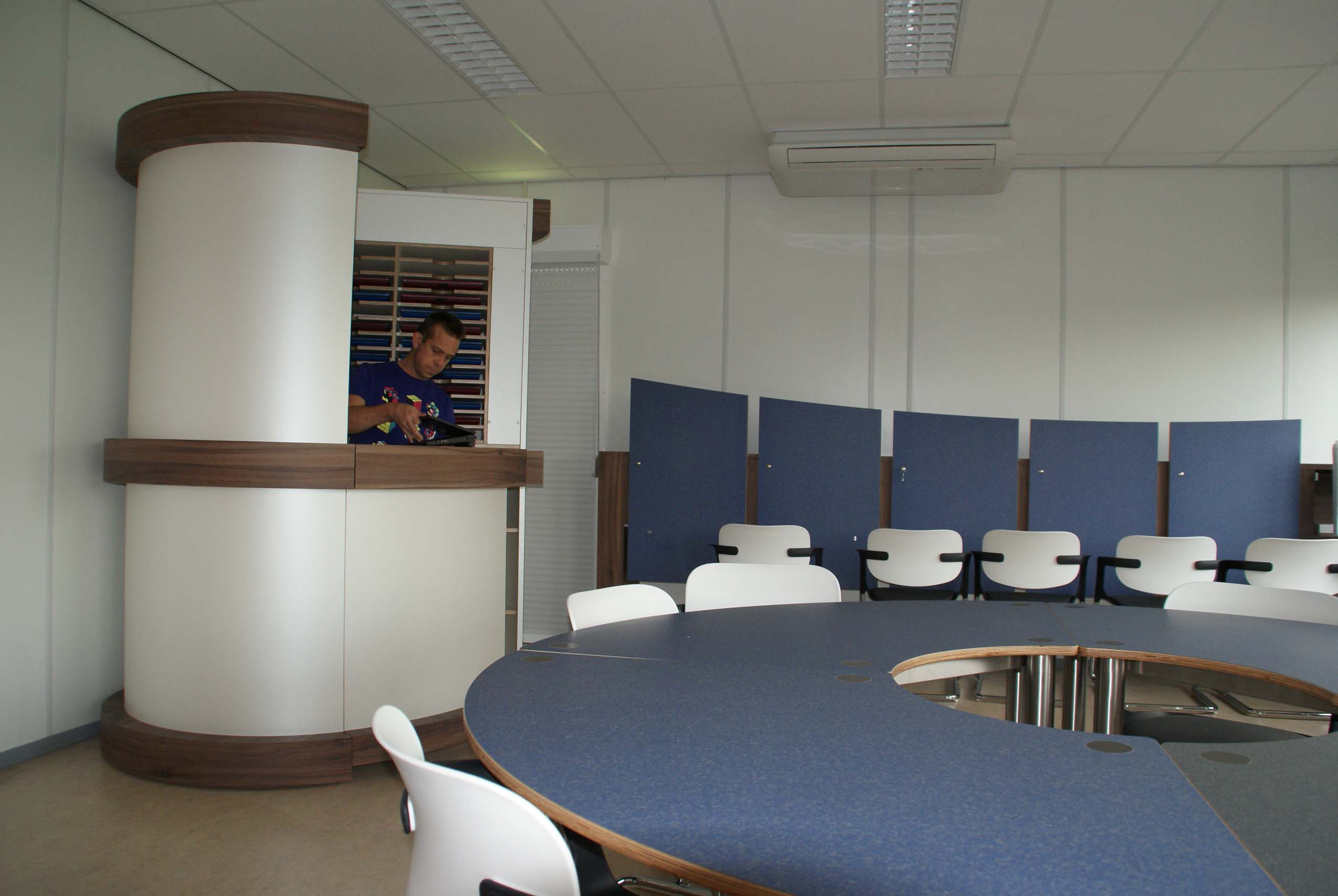 In de ICT ruimte staat een cylindervormige kast welke uitegklapt kan worden tot een servicebalie. In deze kast kunnen ook de laptops worden opgeladen. In gesloten toestand kan de kast in een hoek van het lokaal worden geplaast.