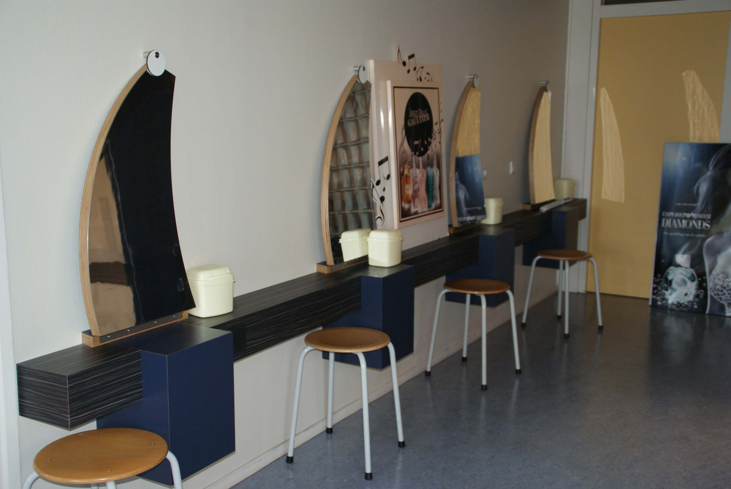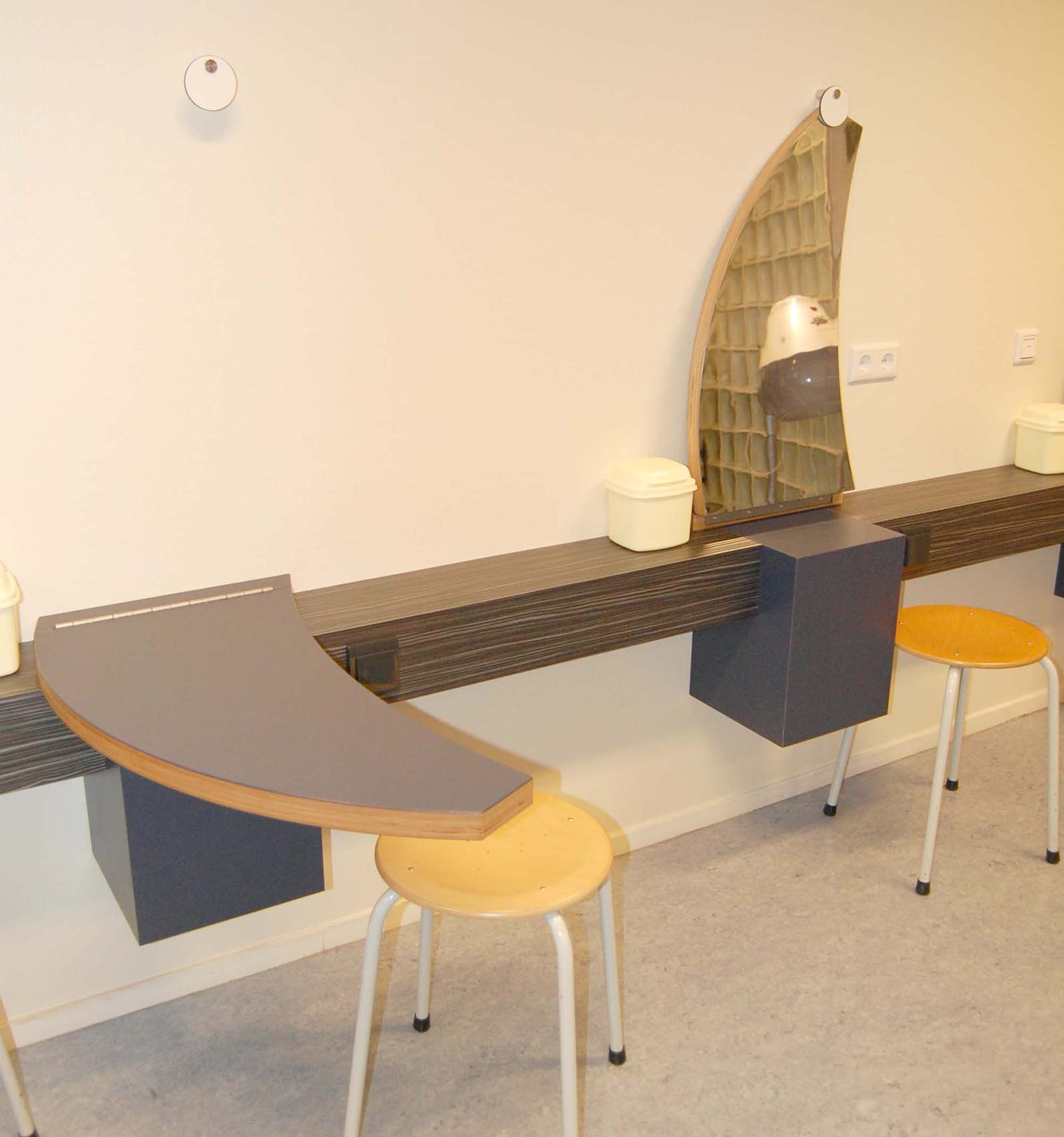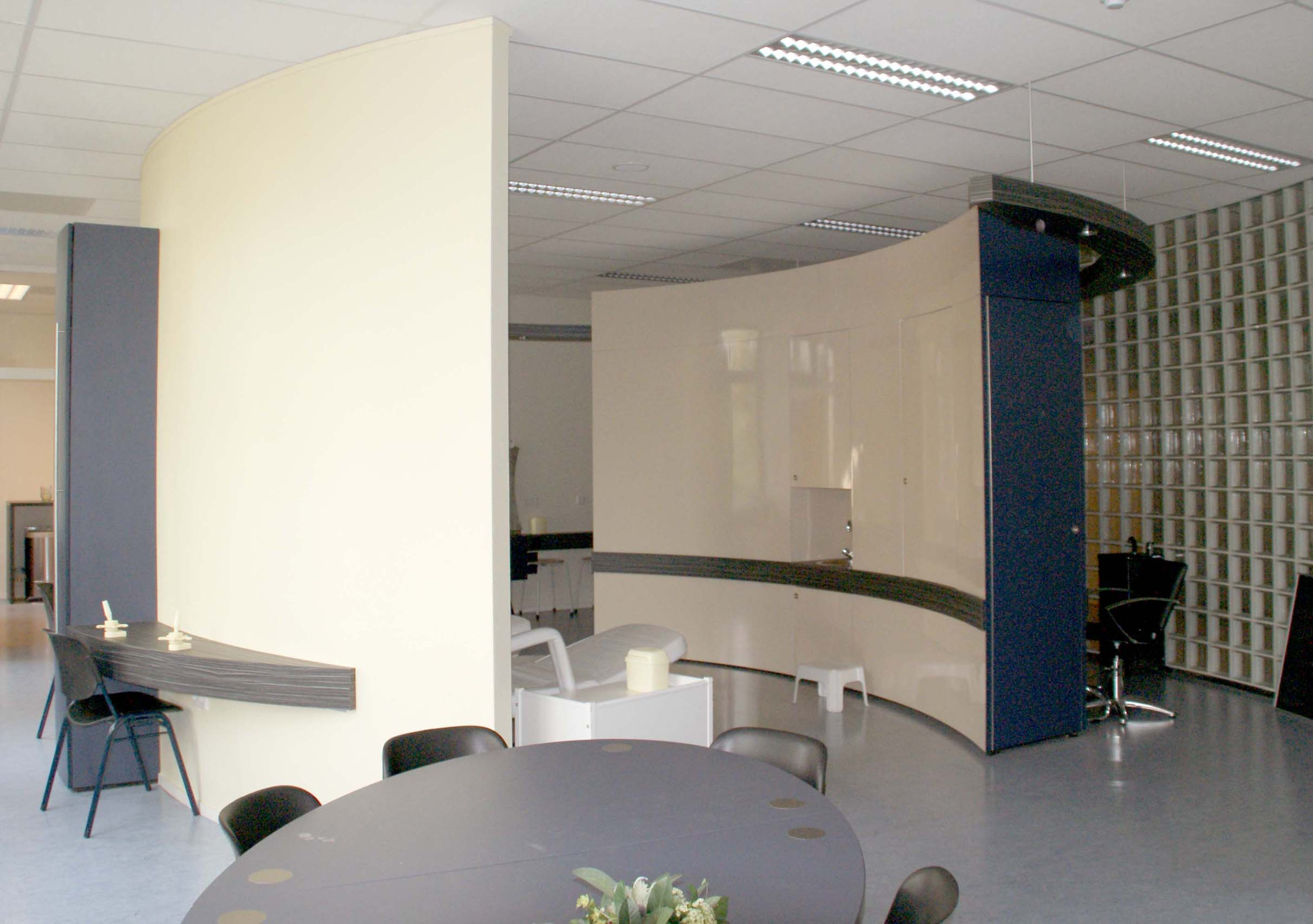 Het verzorgingslokaal wordt verdeeld in verschillende ruimtes door 2 ronde kasten. Hierdoor ontstaan ruimtes voor een kapsalon, een massageruimte en kapspiegels. Ook zijn wandelementen uit te klappen tot een nagelstudio.
